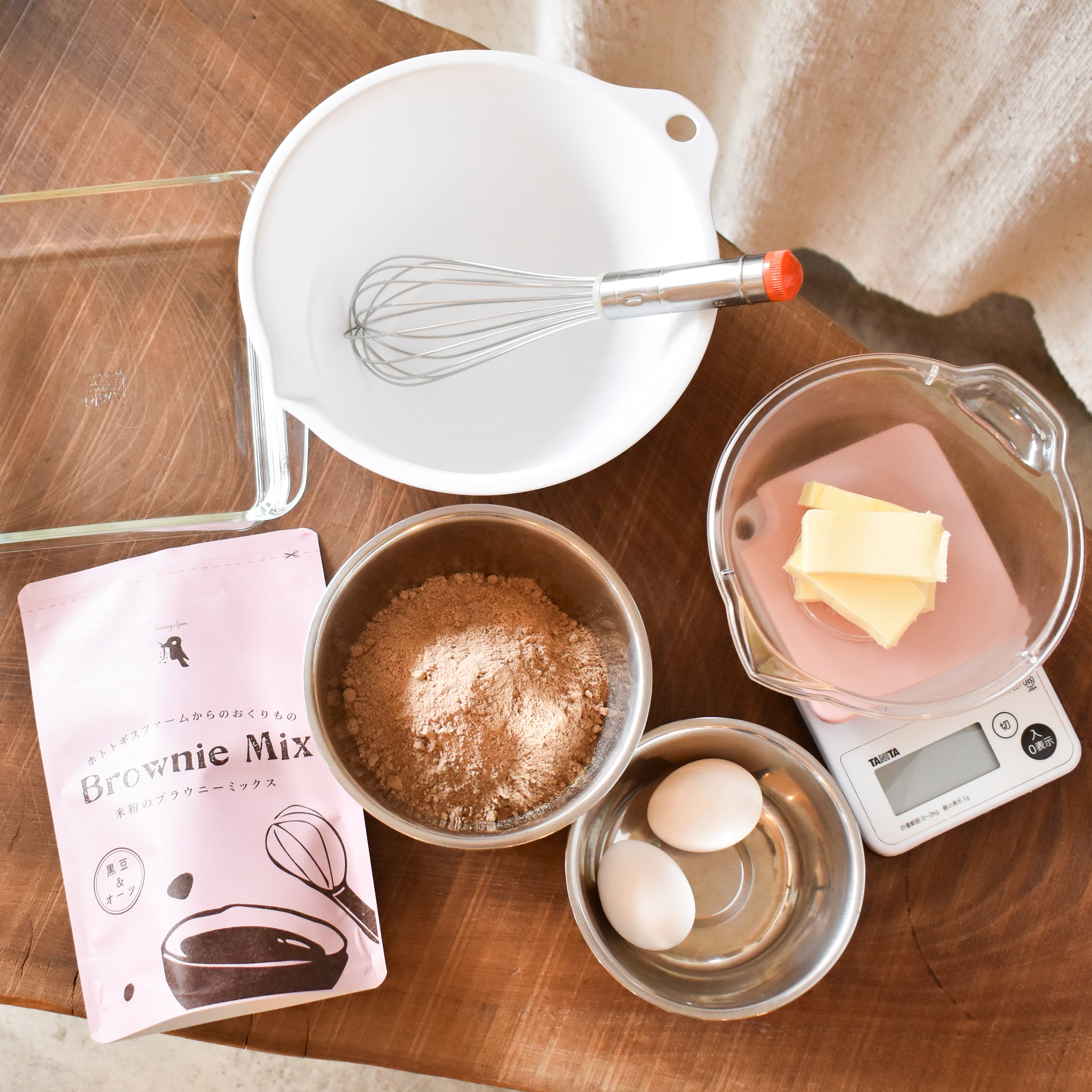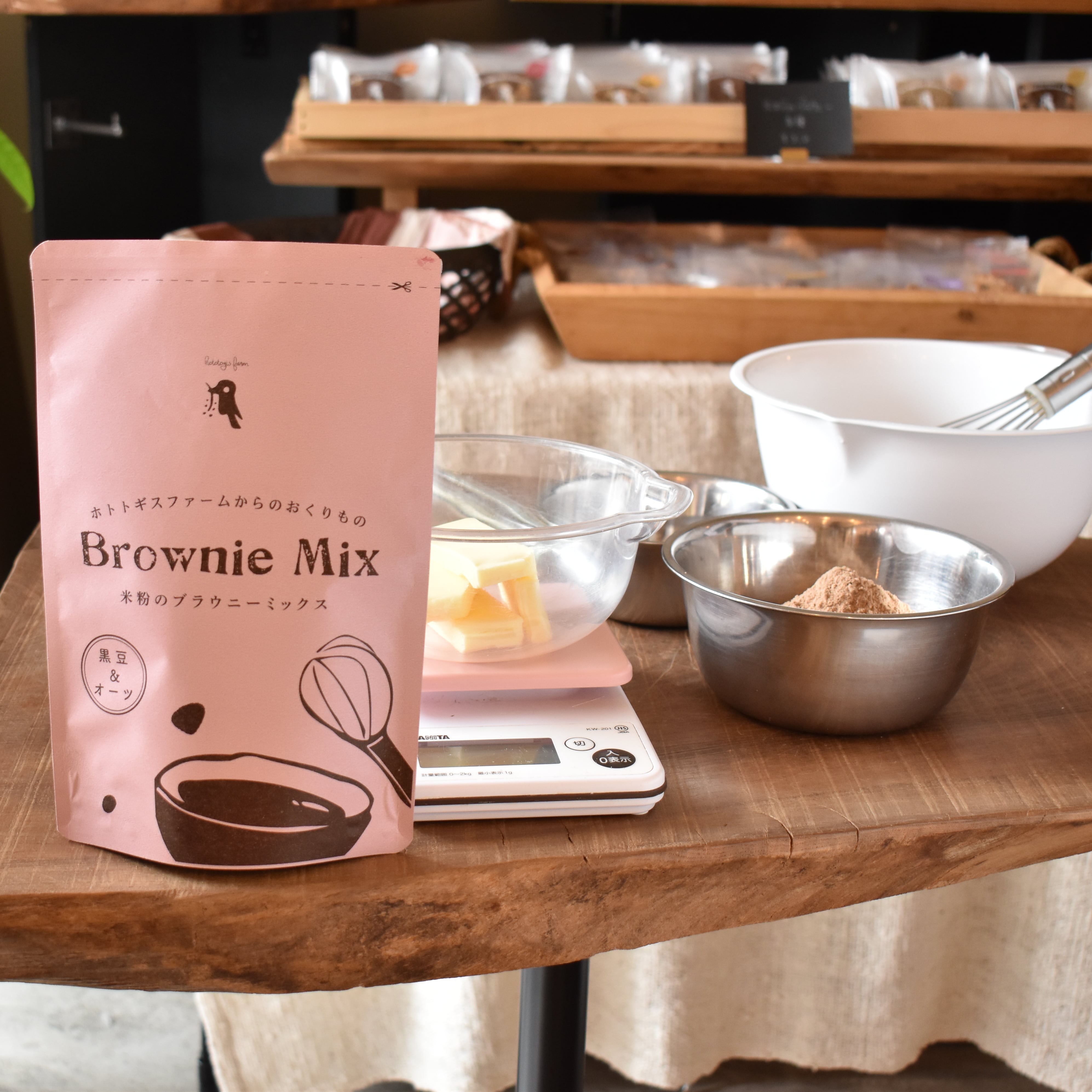 数年前から温めていた商品がついに実現しました。自分で好きな材料をトッピングしたり、生地に練り込んだり、味わいが無限に広がる米粉のブラウニーミックスです♪