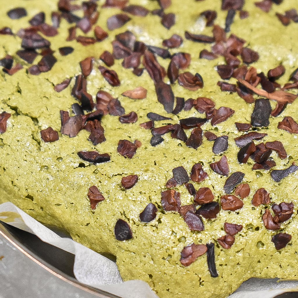 見た目が鮮やかな若葉色の生地にカカオニブのトッピングが賑やかで目を惹くブラウニー。