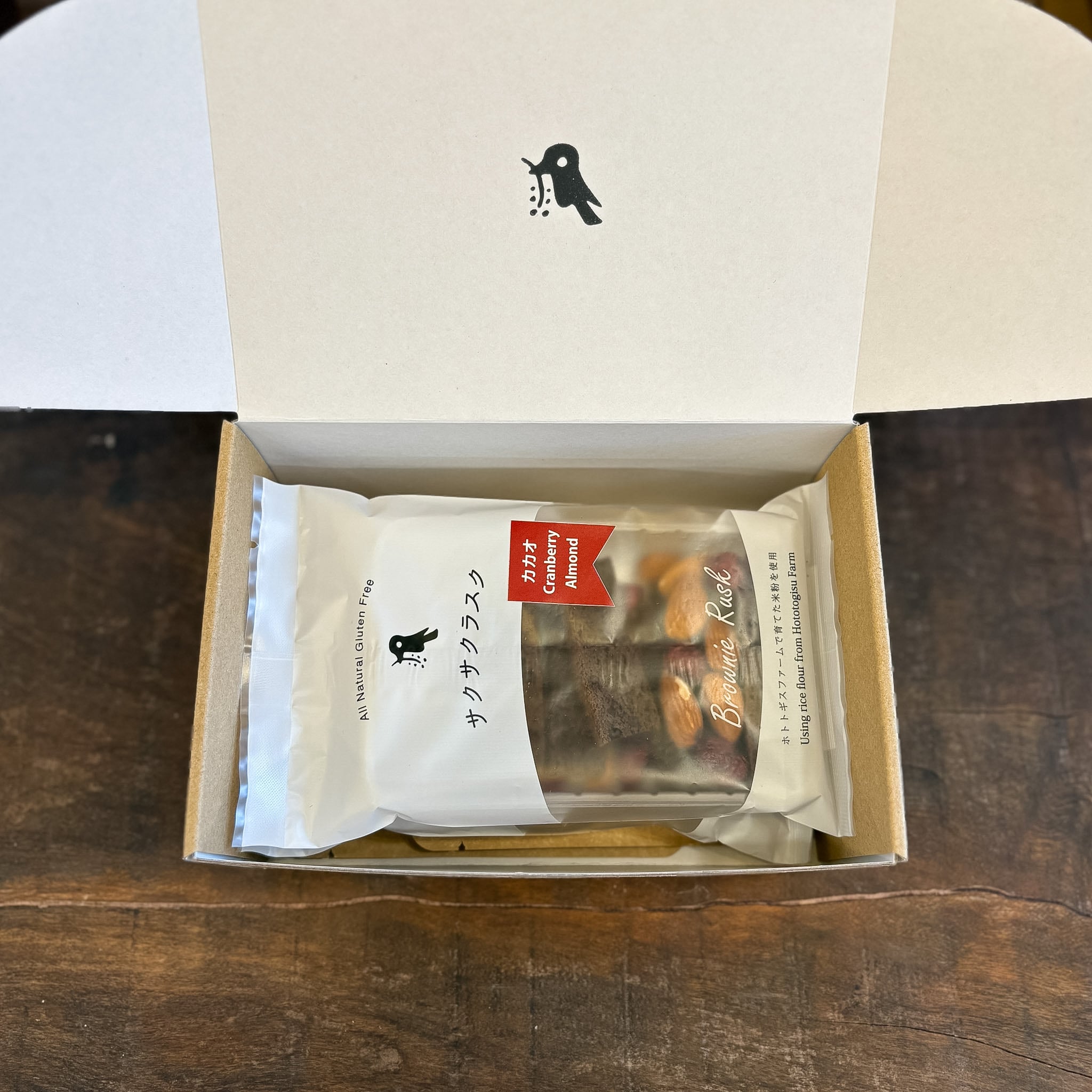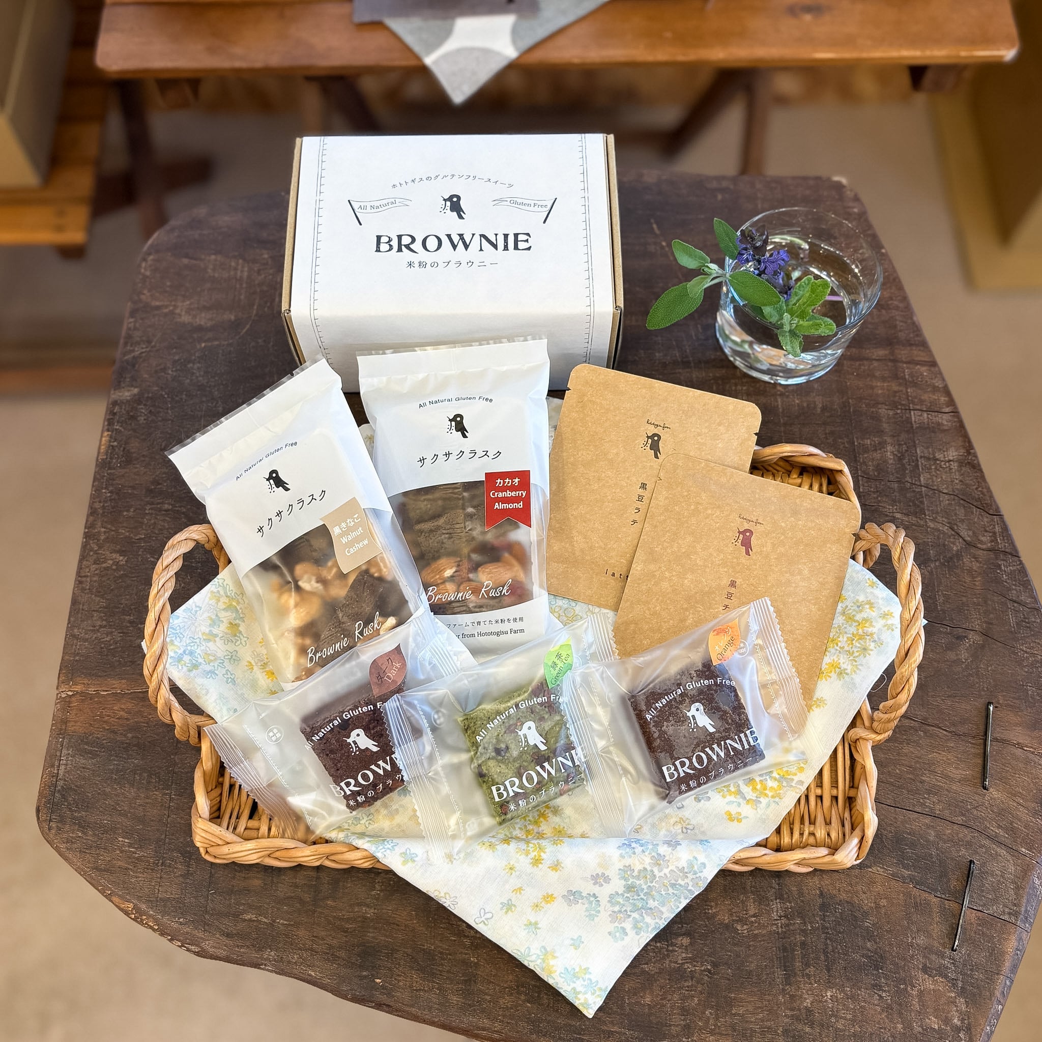 1箱に米粉のブラウニーやラスク、黒豆ラテやチャイまで入った