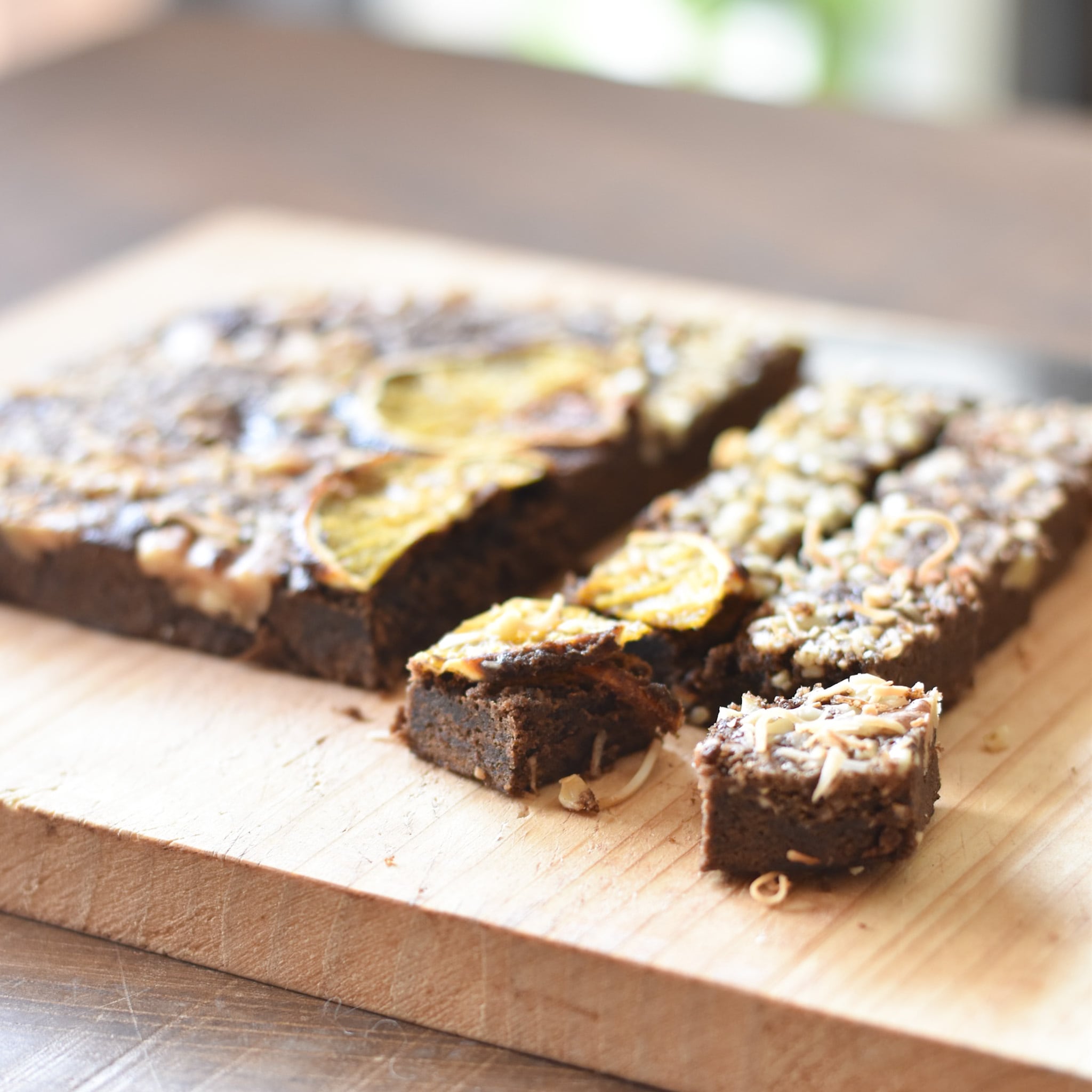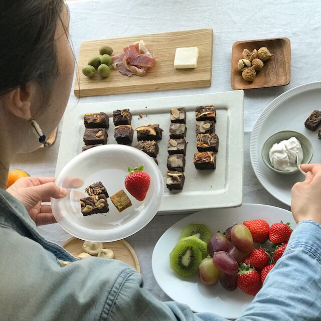 一口サイズに切り分けて、大勢で楽しめる大きなままの「米粉のブラウニー」。